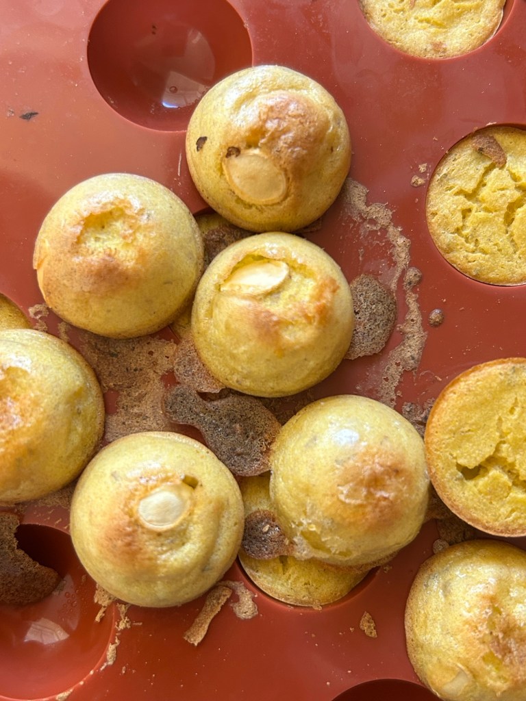 Once you have your batter, it’s up to you but I will occasionally smoosh the fresh fruit first into the mold, followed by the batter to make it look very gourmet.