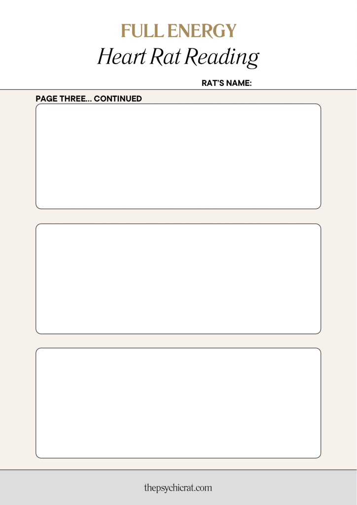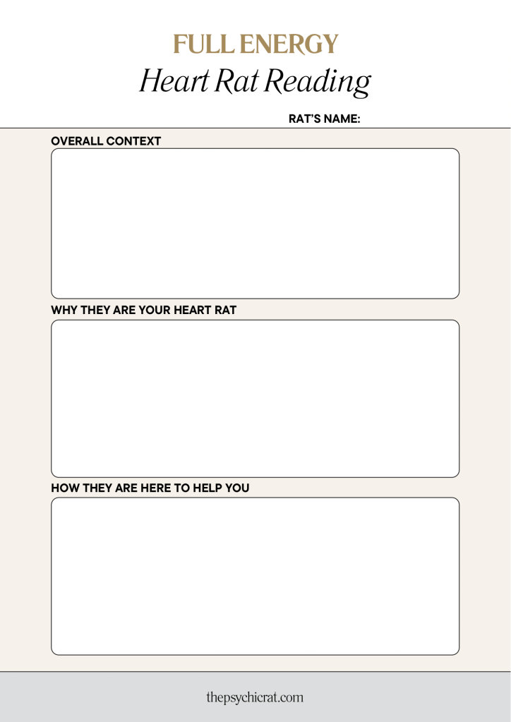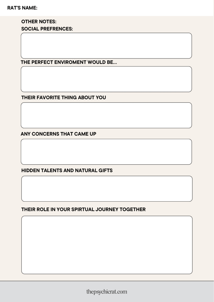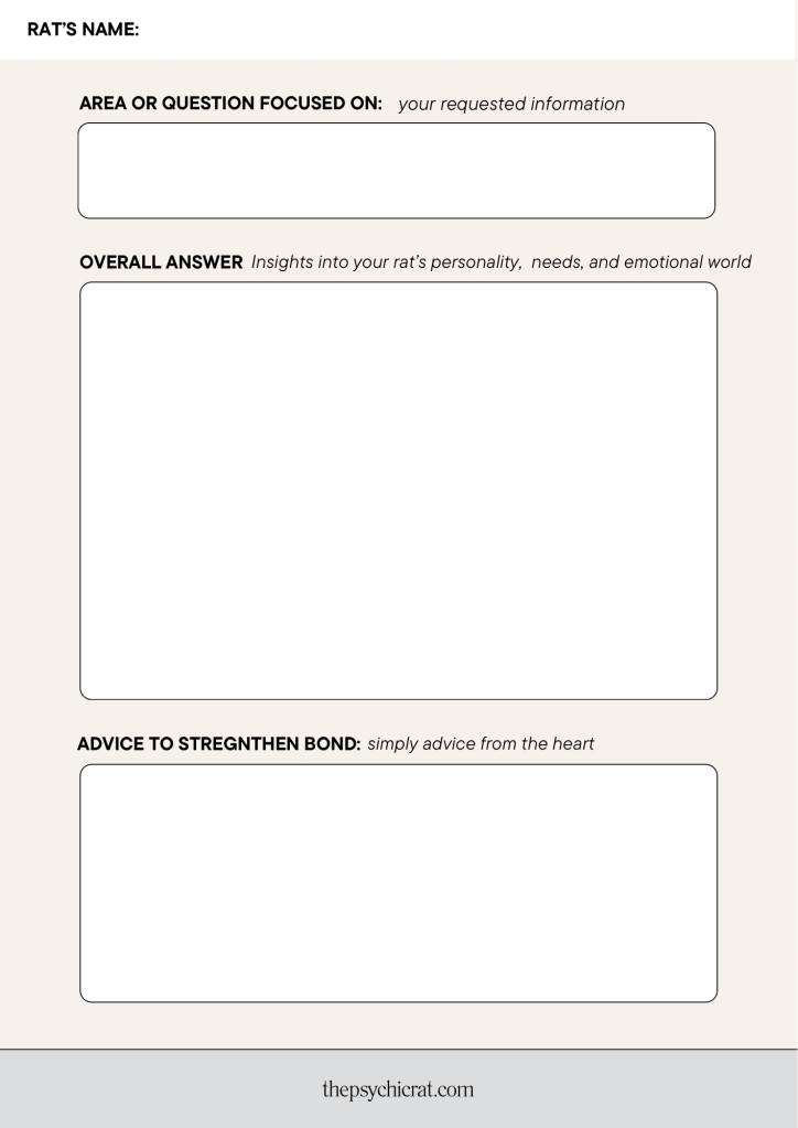 I feel a special connection to rats and their energy. Our easy to fill out form will include your rats name, age, gender, and a recent photo for me to focus on. My readings can take anywhere from 5minutes to over an hour.