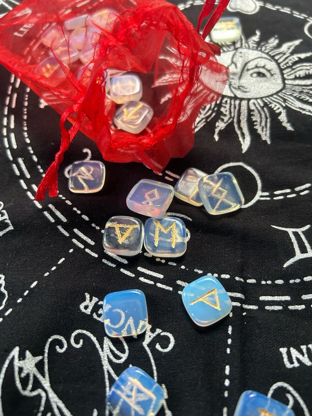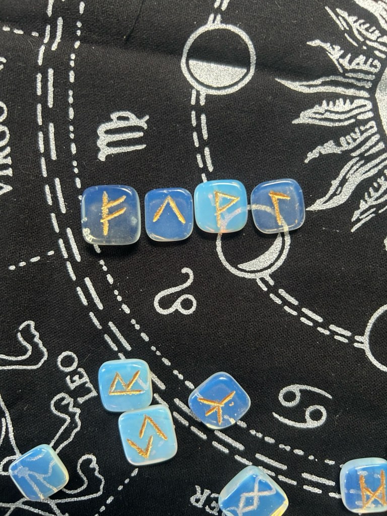 Ahh, the throwing of the runes. One of the best ways to have a story unfold. I will decipher each rune turned upward with our toss. From the center, outwards, we can read the stones energy.