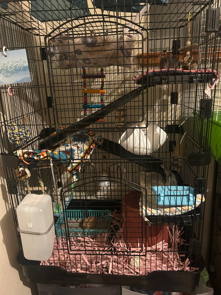 Our cages are cleaned out routinely. With a deep clean once a week. Including replacing or washing hideaways, bedding, and bowls.
