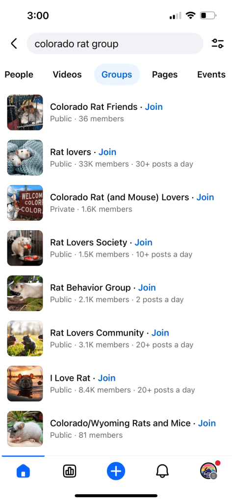 Next, you should begin posting and joining rat groups in your area. For example, I live in CO, I am in a CO/WY Rat Group. You can find groups to join by using the search bar. There are also rehoming rat groups you can join as well.