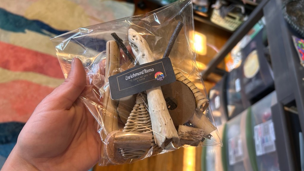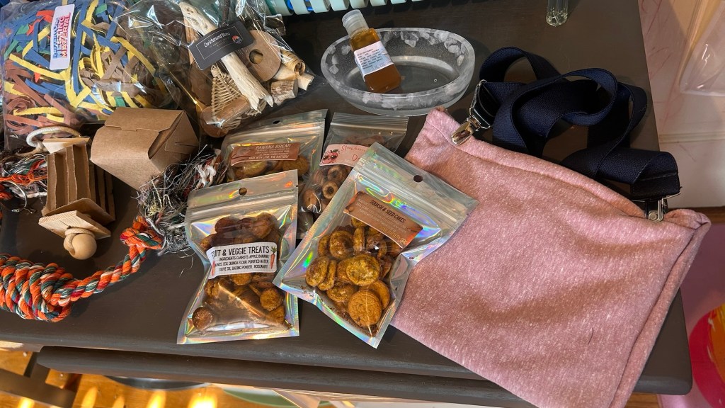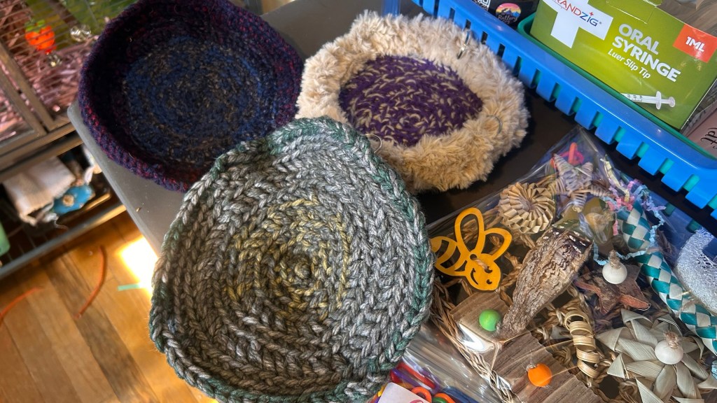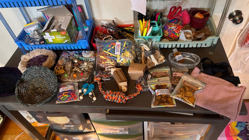 This complete rat kit includes: (everything is handmade) rat soap, nesting materials, resin food dish, bonding pouch, assortment of treats, 3 crocheted hammocks, 2 sewn hammocks, 2 tray liners, along with 8 toys + boredom breakers.