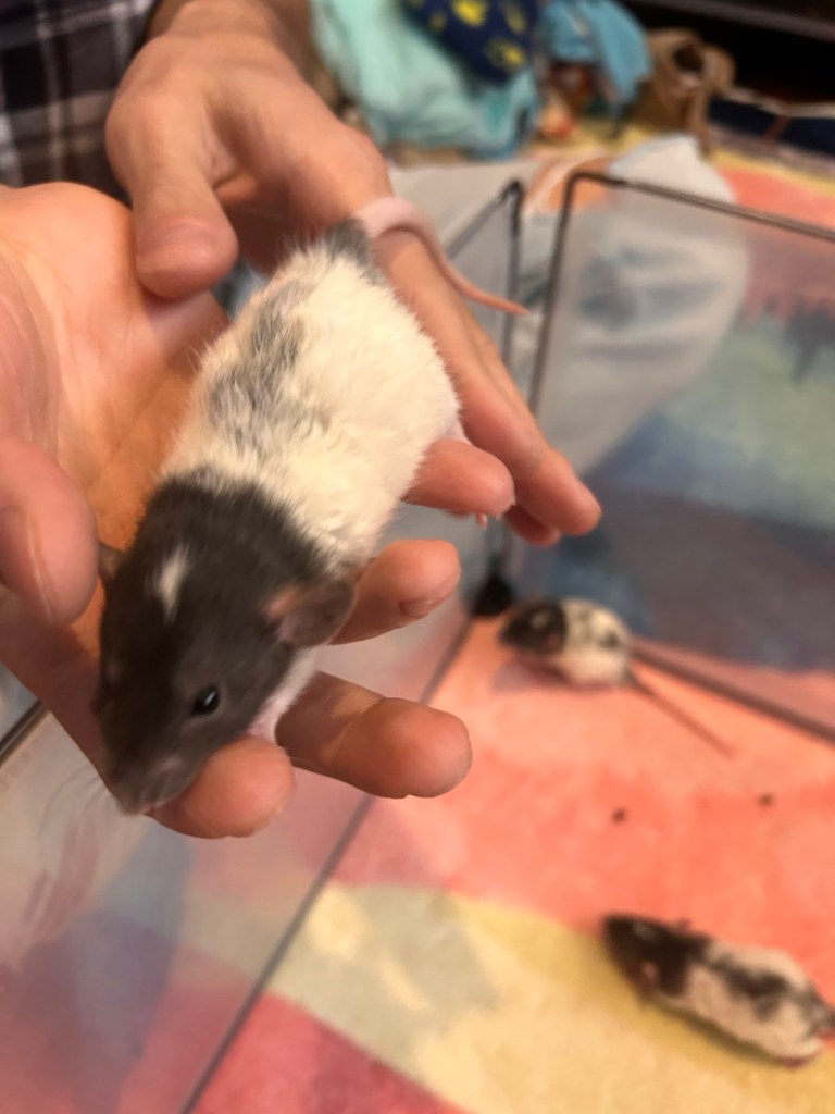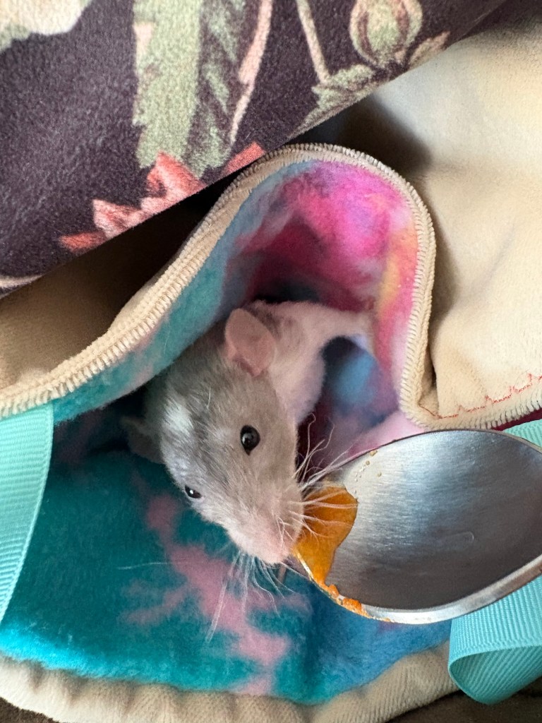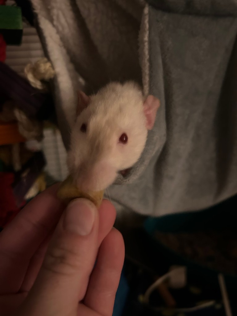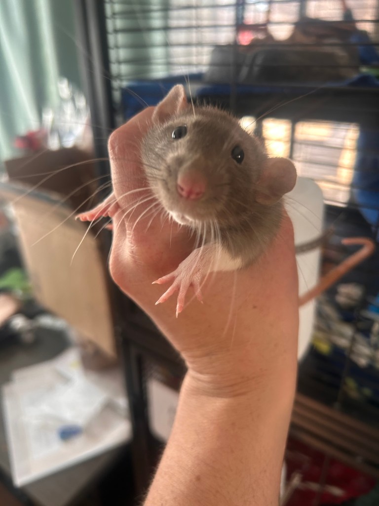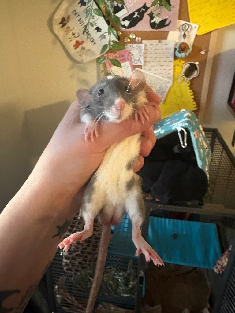 Spriggan is my brave lil explorer, and already walks up to the cage door whenever I’m near. He is down for bonding pouch time 24/7, and is very comfortable free-roaming. I haven’t had such a confident rat in so long that when he jumped up my arm on like day 2 it surprised me 😭 He for sure is my climbing and foraging lil dude.