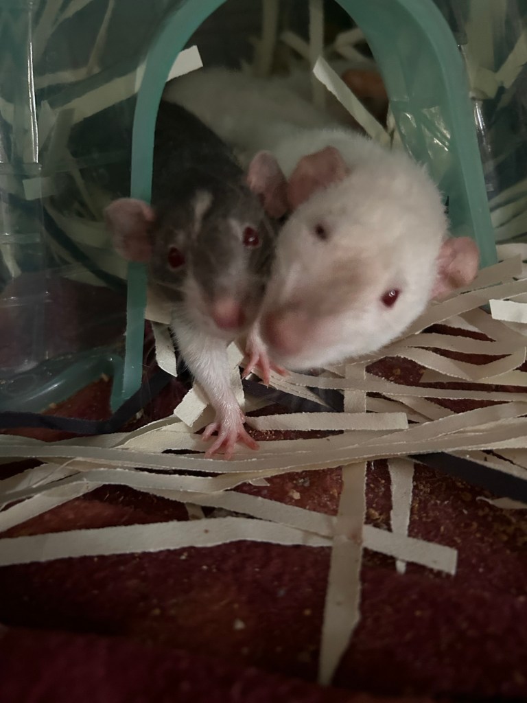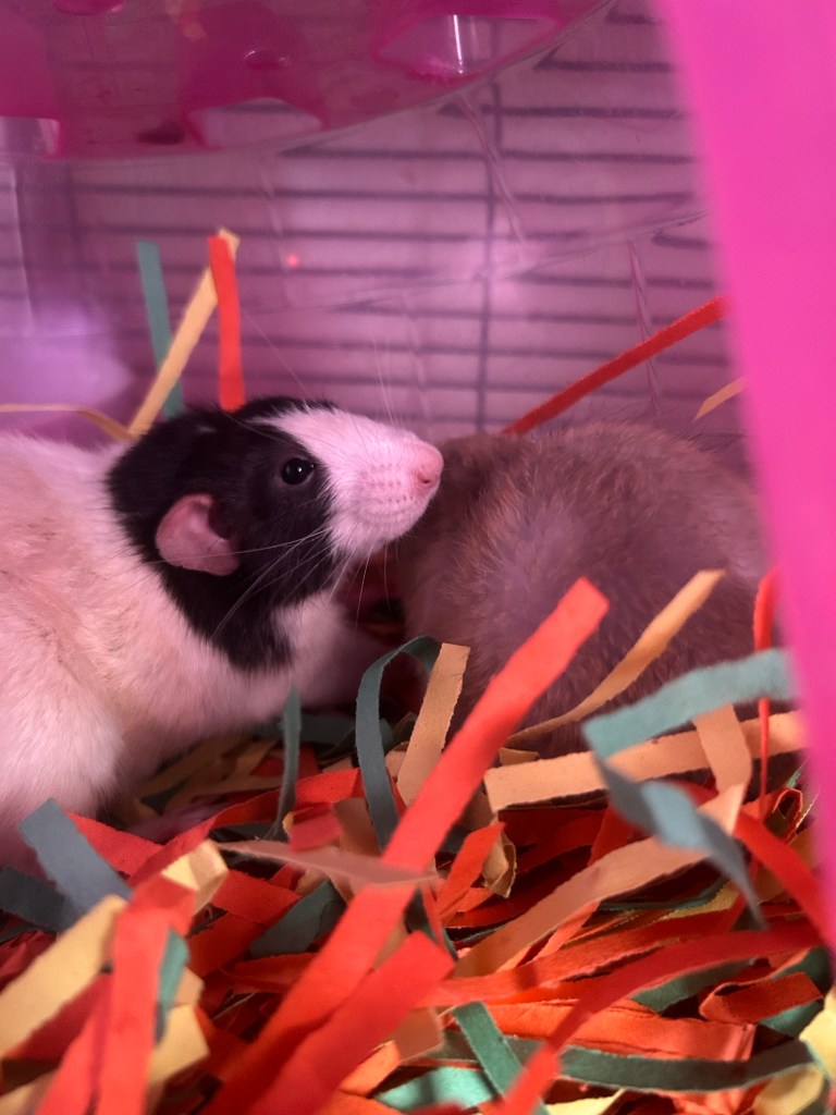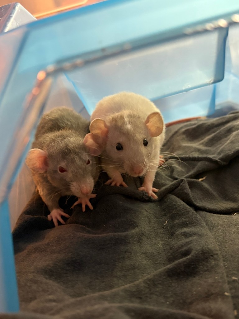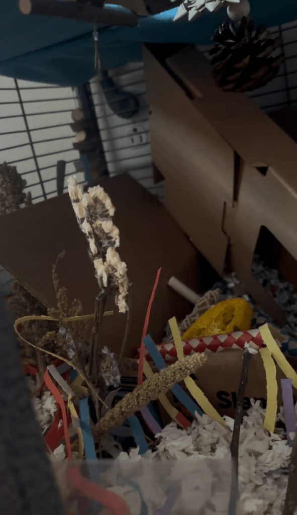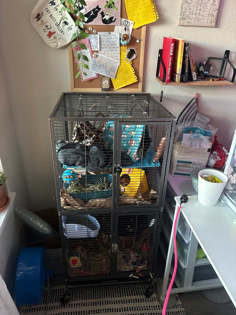 They’re both really healthy and eating/sleeping/drinking well, and it just blows me away how socialized they already are. I decorated their cage with slightly “easier” climbing routes and watching to make sure Boggle can navigate them, but other than that I have absolutely zero concerns about their health and temperament.