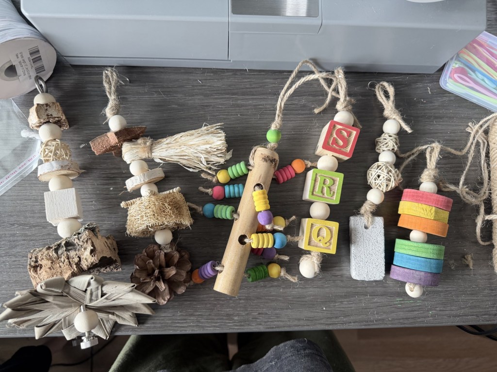 Includes nesting materials, 6 toys, bag of boredom breakers, and 5 bags of treats. (Bags of treats usually contain about 8 treats.)